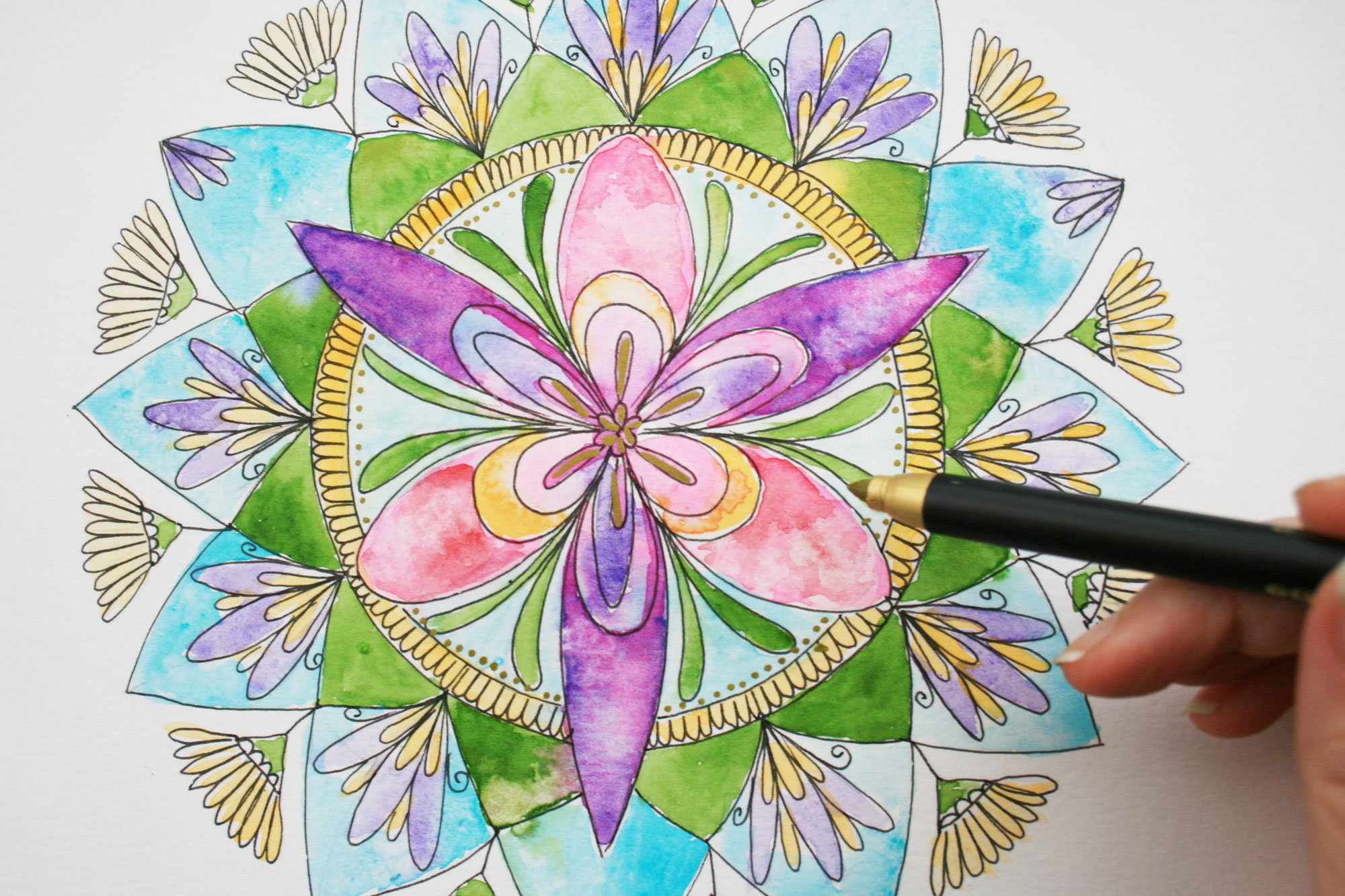 Once we have our inspiration deck and a wide variety of Motifs in pen, ink, watercolor and gouache we progress through to Drawing & Coloring our own Mandala Designs. Then creating Mindful Botanical Mandalas in watercolor and ink to really combine the healing energy of nature with the meditative process of Mandala creation.
